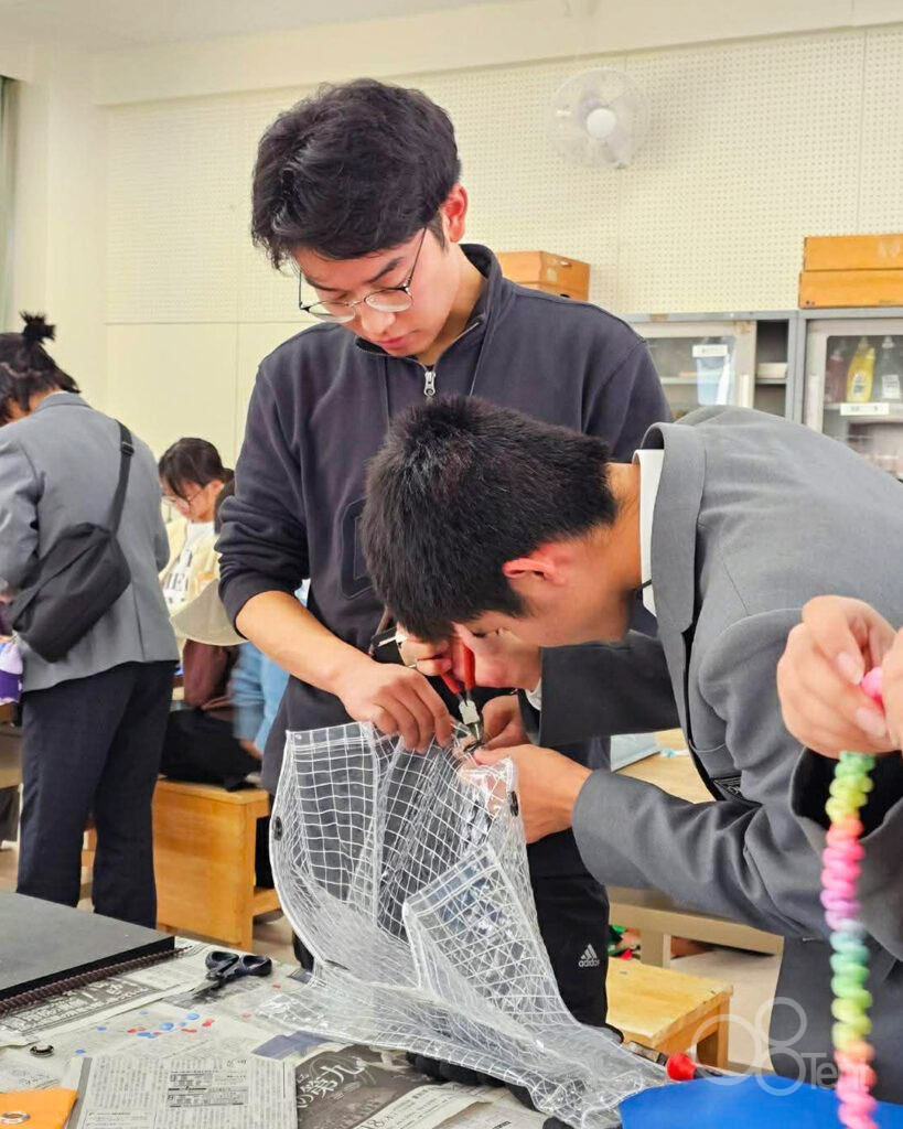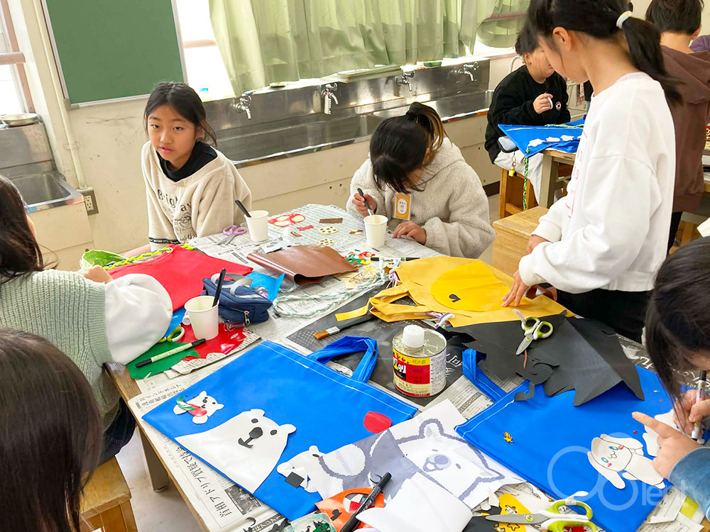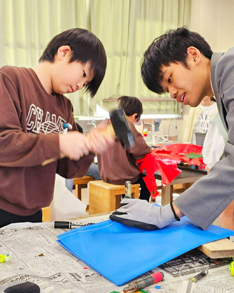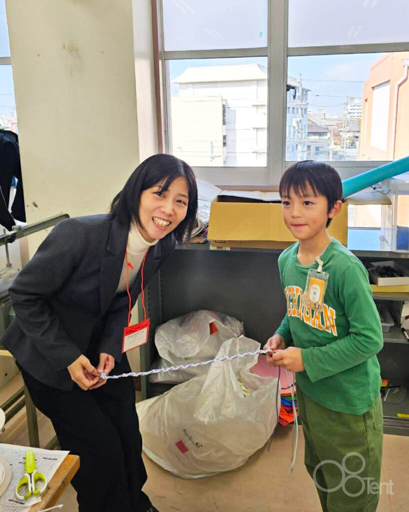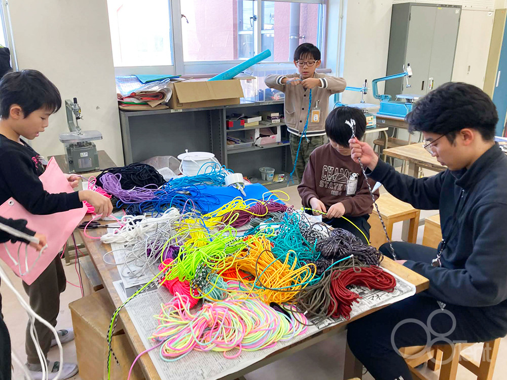 授業では、当社が扱うテント生地の端材を素材として用い、講師役の高校生が小学生に対してロープの編み方やハトメの打ち方、道具の使い方などを教えながら オリジナルバッグづくりに取り組んでもらいました。素材の特性を学びながら、共同で作品を仕上げる体験授業となりました。