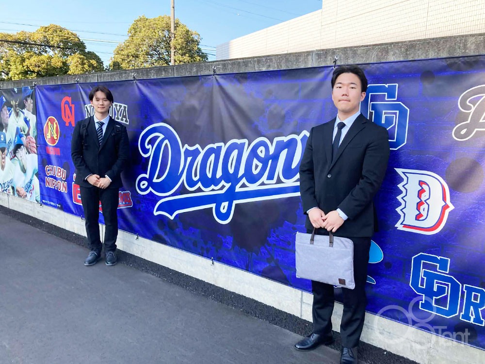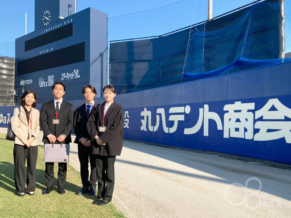 弊社は2026年4月上旬、南山大学より留学生を迎え、短期インターンシッププログラムを実施いたしました。その一環として、入社2年目の若手社員とともに、弊社の看板が掲げられたナゴヤ球場の視察を行いました。