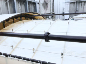開閉式テントの施工詳細 開閉式テントのシート張替え・改修追加工事を承りました。シート部分の張替えに加え、ランナー・シャックル・ワイヤーの交換、フレームの再塗装、側面の風除けシートの追加工事を行いました。