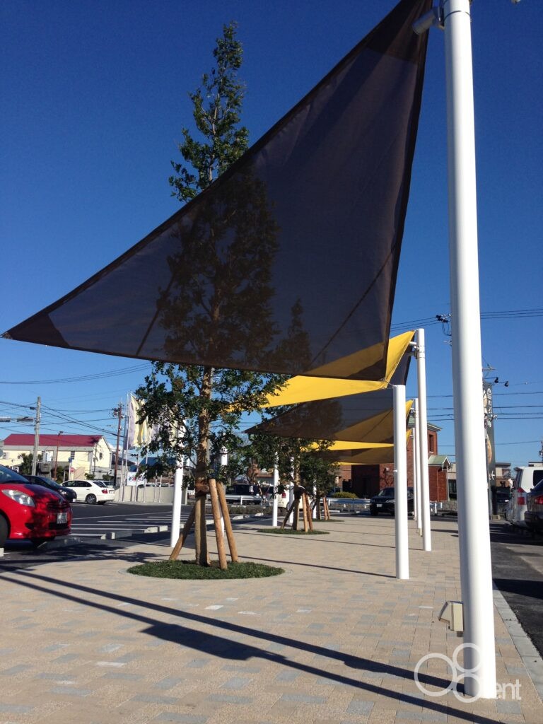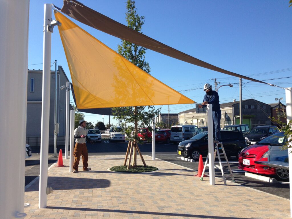 シェード・タープは、公共施設や商業施設などさまざまな場所で利用されており、膜材(シート)をロープや金具で支柱に固定して使用する、シンプルな構造のアイテムです。