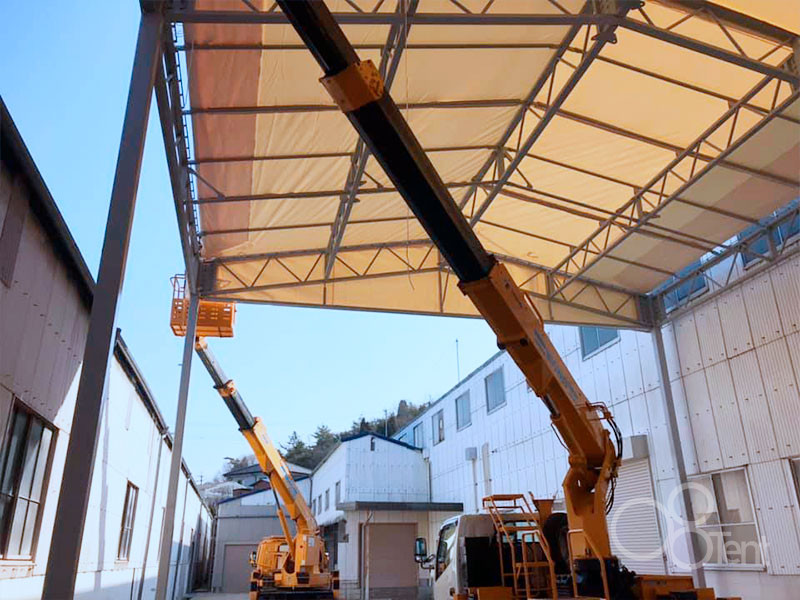 上屋テント(テント屋根)は、雨よけ・日よけ用として、工場や倉庫・トラックヤードなどで利用される大型のテント屋根です。商品や材料の荷捌き、積み下ろし、作業場としてご利用いただいています。