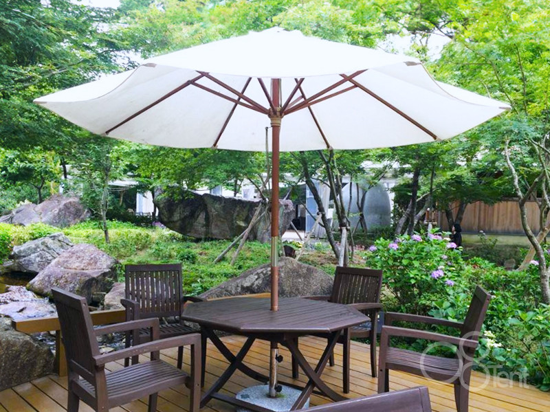 カフェや休憩スペースで使用されるパラソルです。古くからある種類でヨーロッパでも使用され、日やけ防止の機能のほかに、アイキャッチ機能も果たすことができます。パラソル自体は根元をウエイトで支えるタイプの製品です。