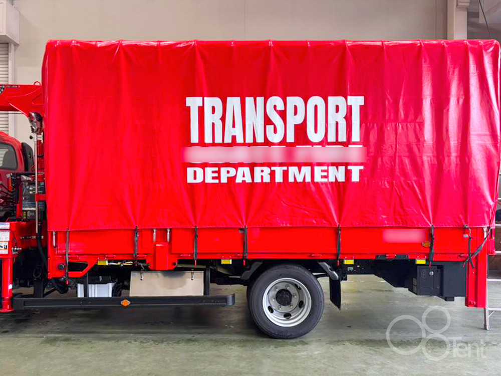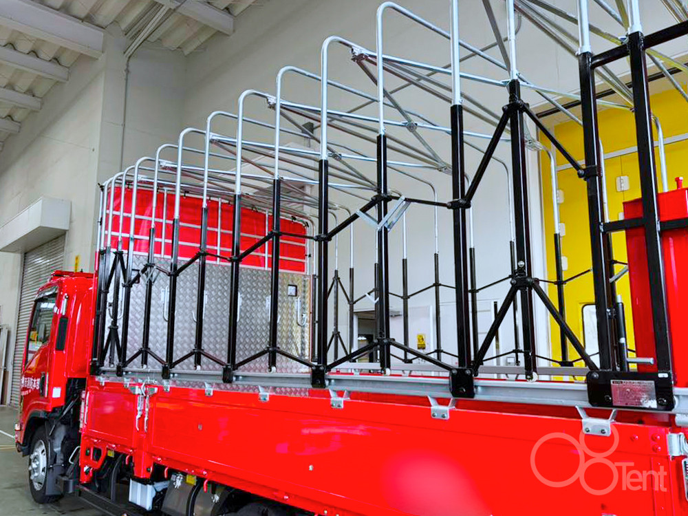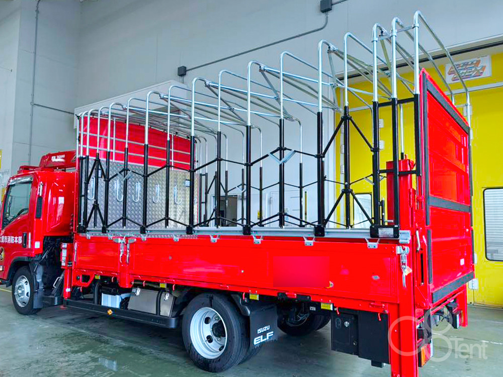 伸縮式トラック幌カバーを製作いたしました。特殊車両(消防車)の特注カバーとなります。両側面・背面に消防署名を施しました。赤色の生地×白色のロゴとなります。