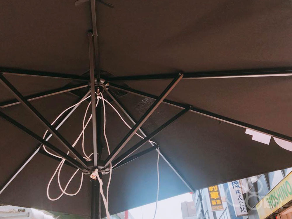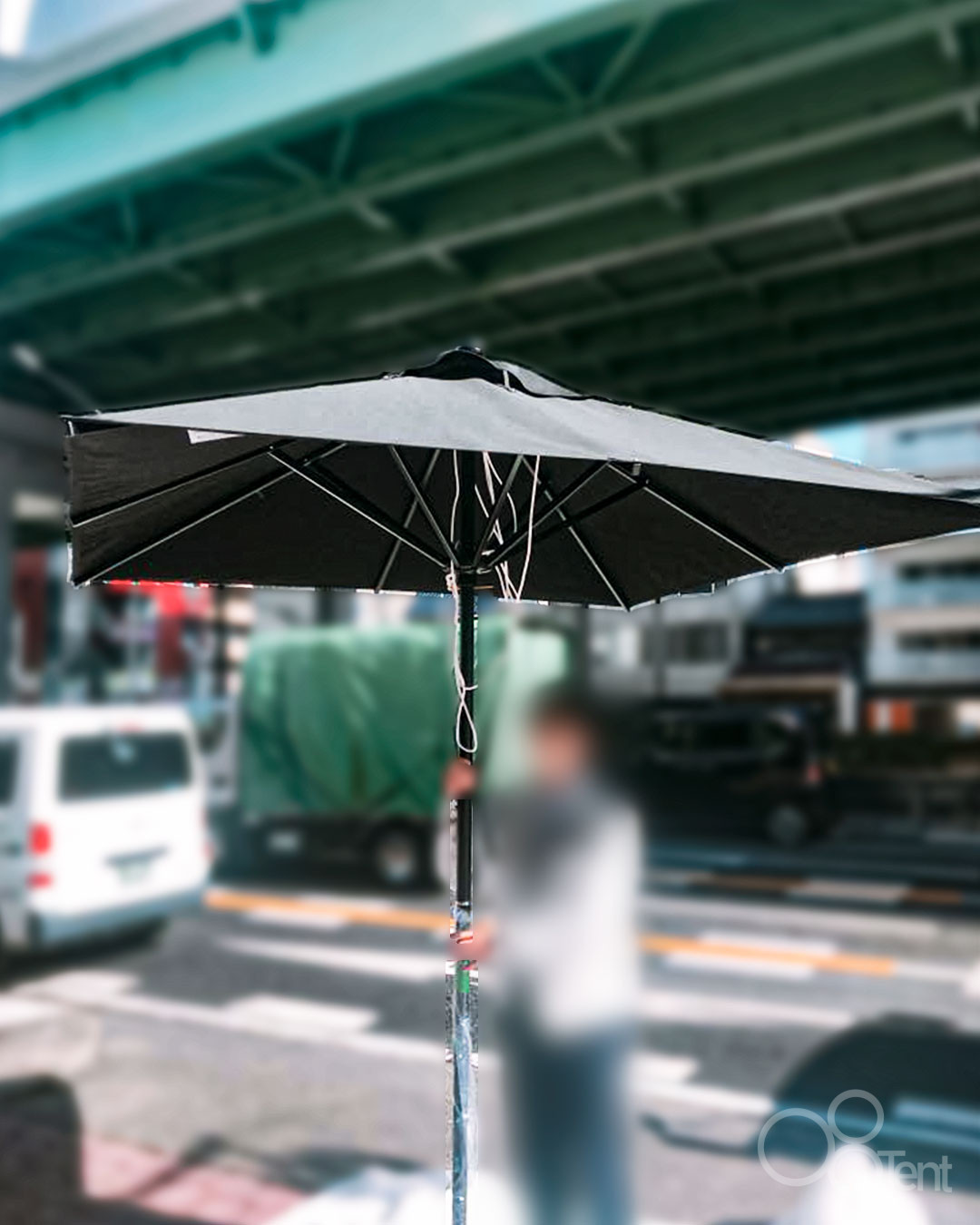 カフェや休憩スペースで使用されるパラソルです。古くからある種類でヨーロッパでも使用され、日やけ防止の機能のほかに、アイキャッチ機能も果たすことができます。パラソル自体は根元をウエイトで支えるタイプの製品です。
