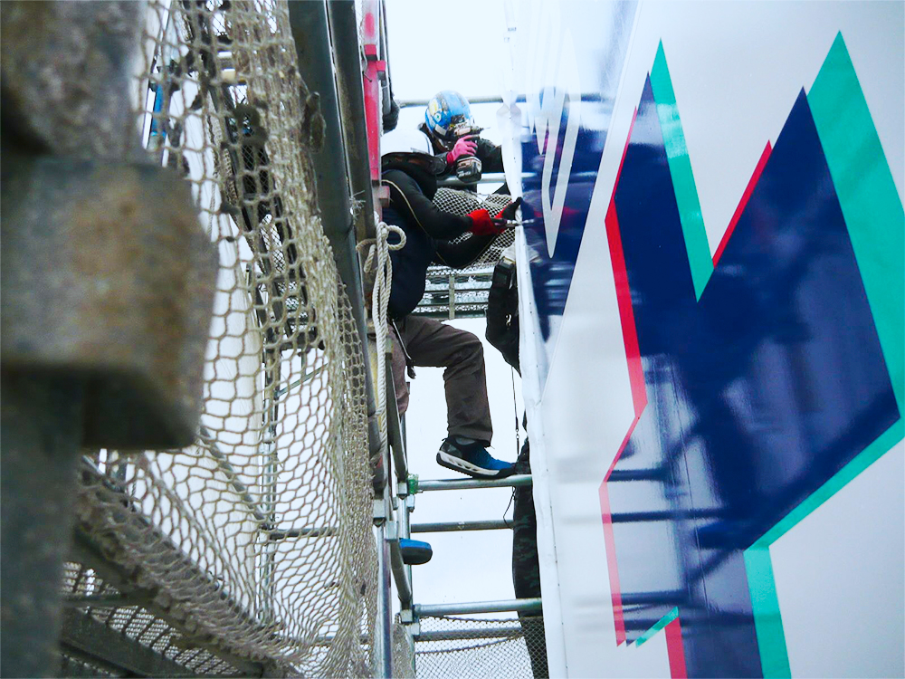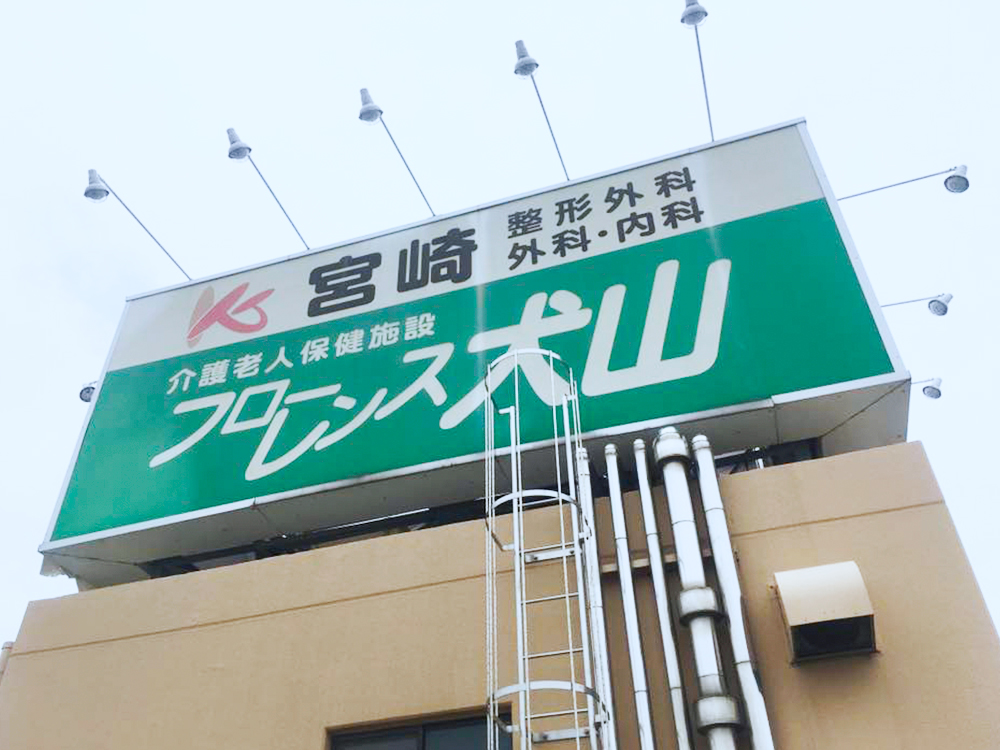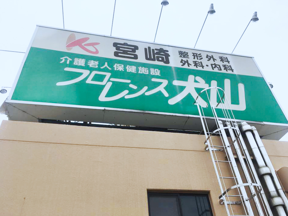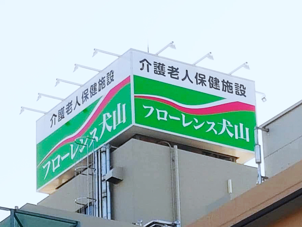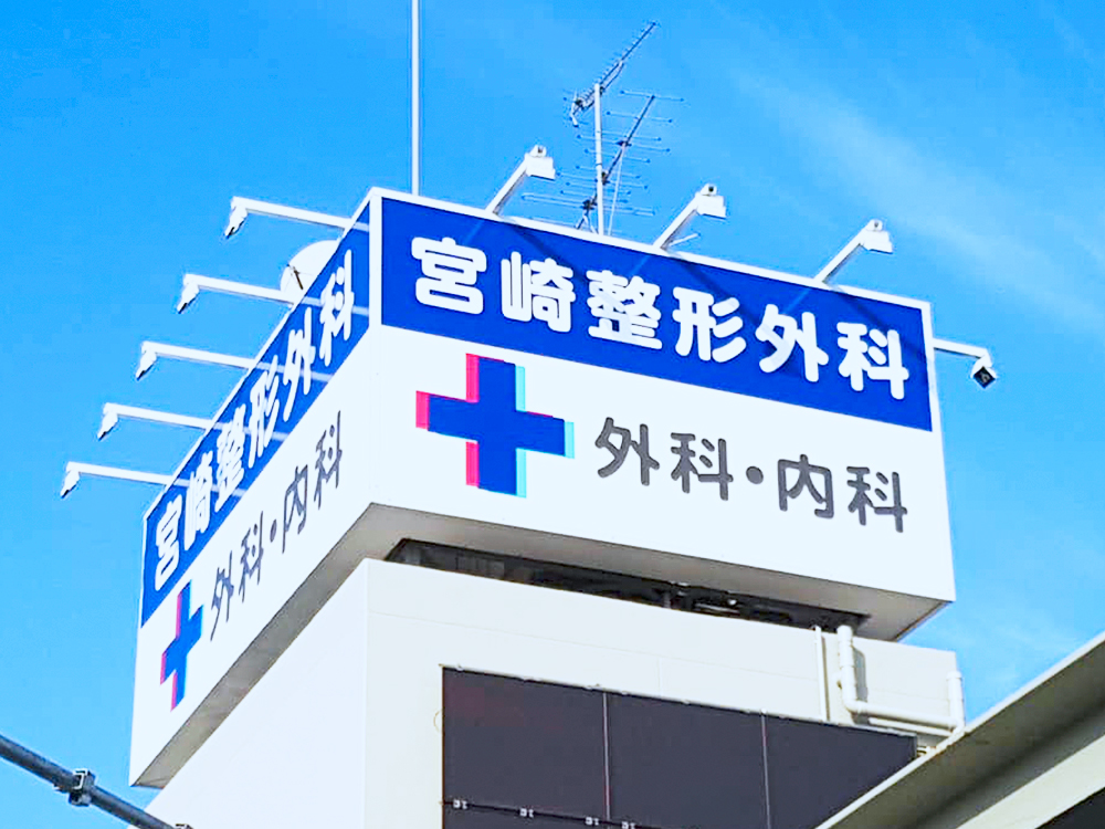 医療ビル屋上にテント看板を施工いたしました。4面それぞれ別のデザインの看板を取り付けることも可能です。