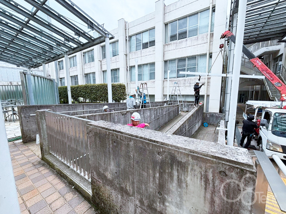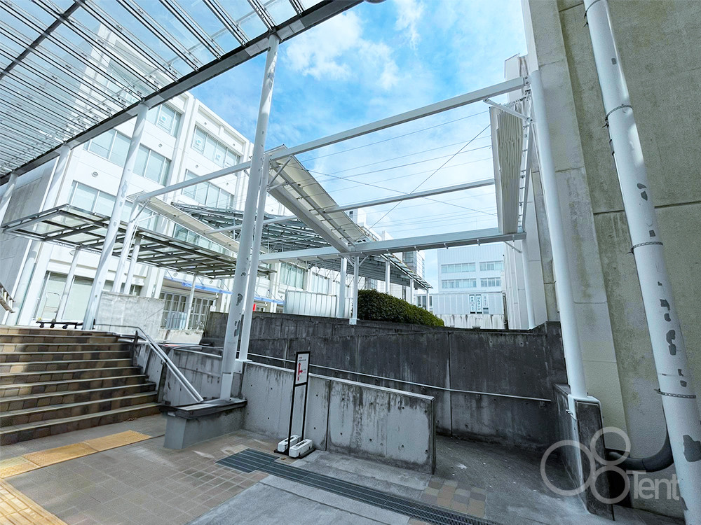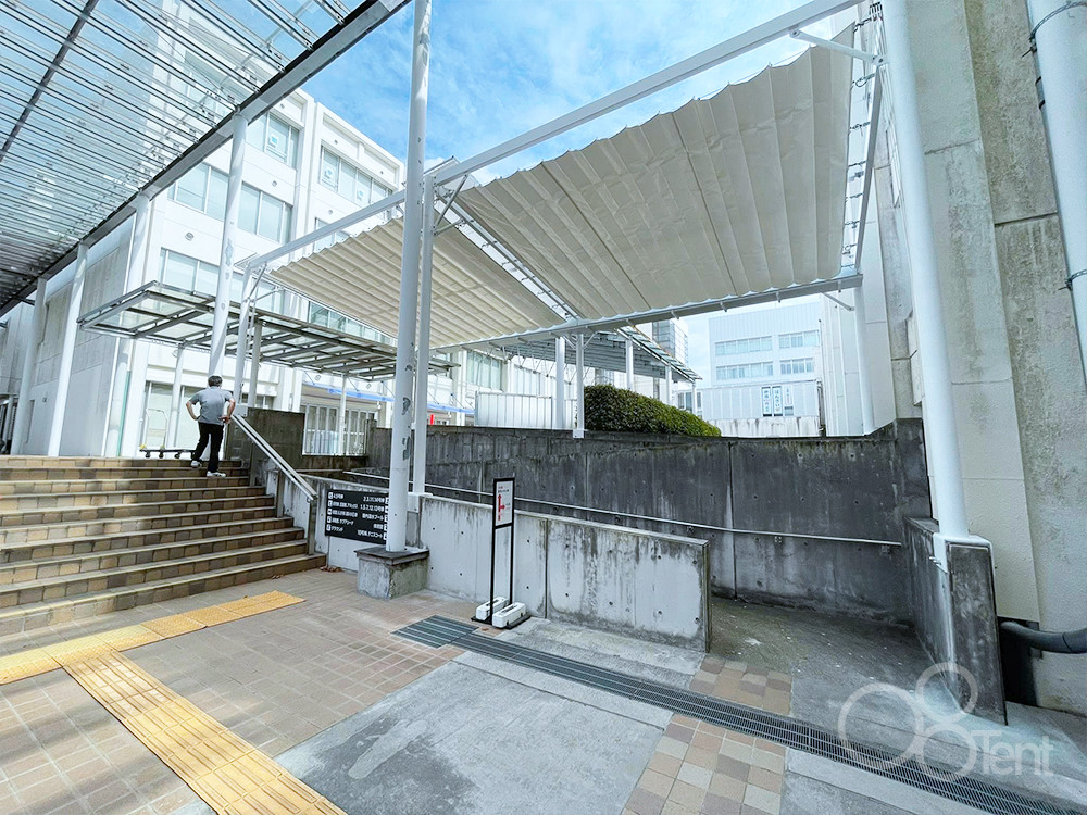 開閉テントを大学構内・屋外スロープ通路の雨よけとして施工