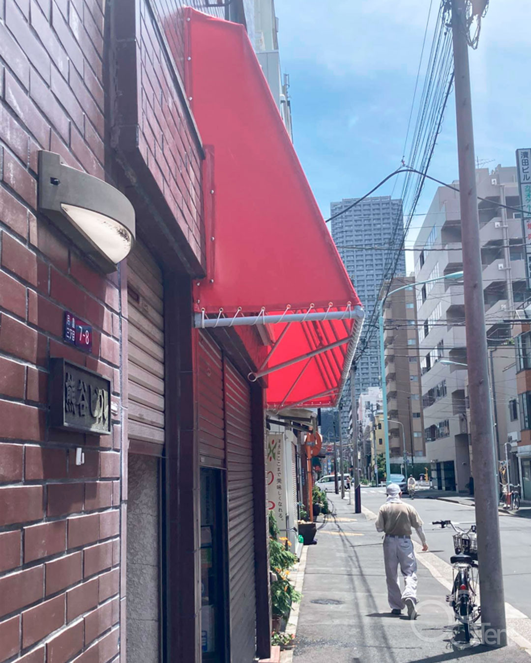 店舗用テントとは、お店や建物の入り口・外壁・窓周辺などに取り付ける日よけ・雨よけとして利用できる固定式のテント屋根です。