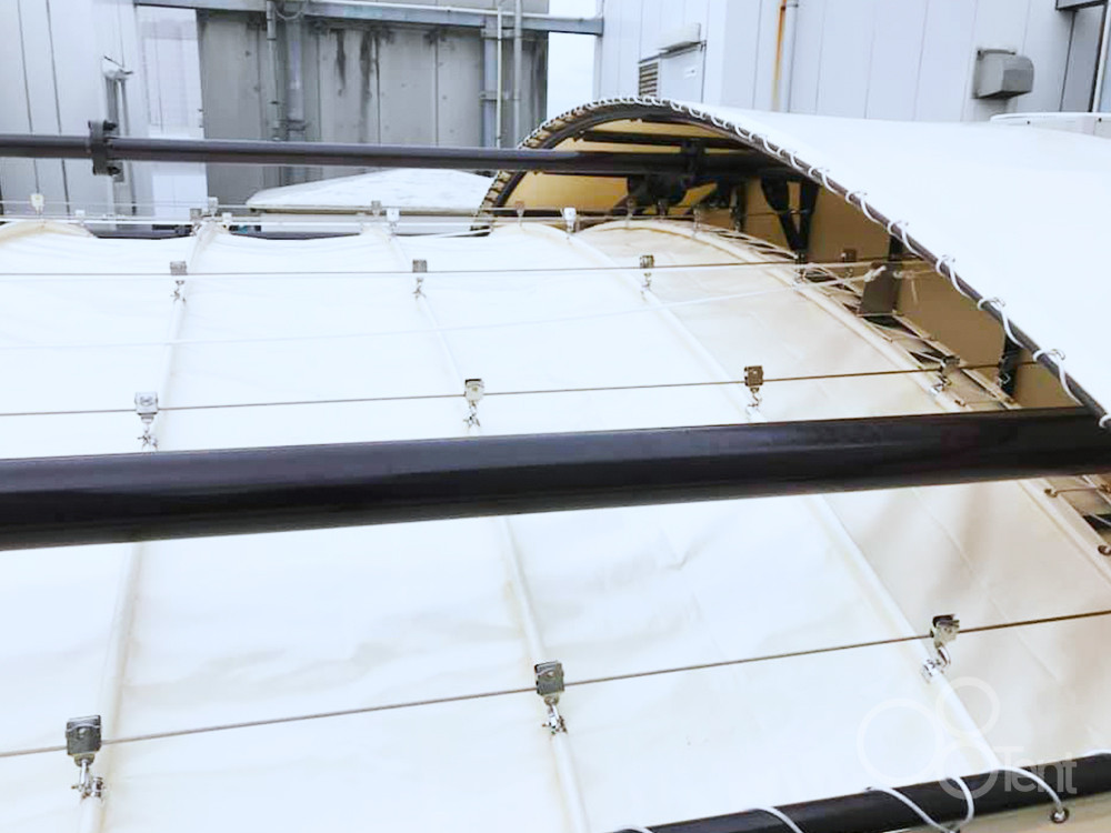 開閉式テントのシート張替え・改修追加工事を承りました。シート部分の張替えに加え、ランナー・シャックル・ワイヤーの交換、フレームの再塗装、側面の風除けシートの追加工事を行いました。