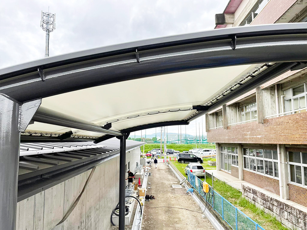 片持ちの固定テント屋根を、岐阜県大垣市・公共施設の建物屋根と繋がるように施工いたしました。