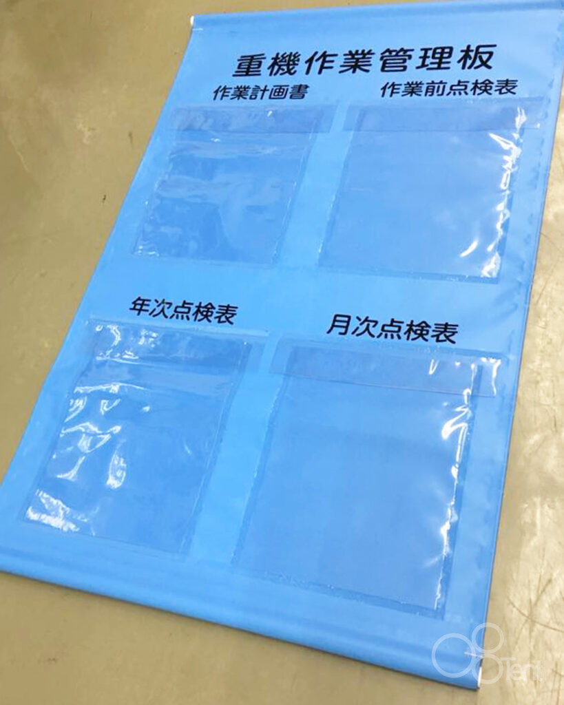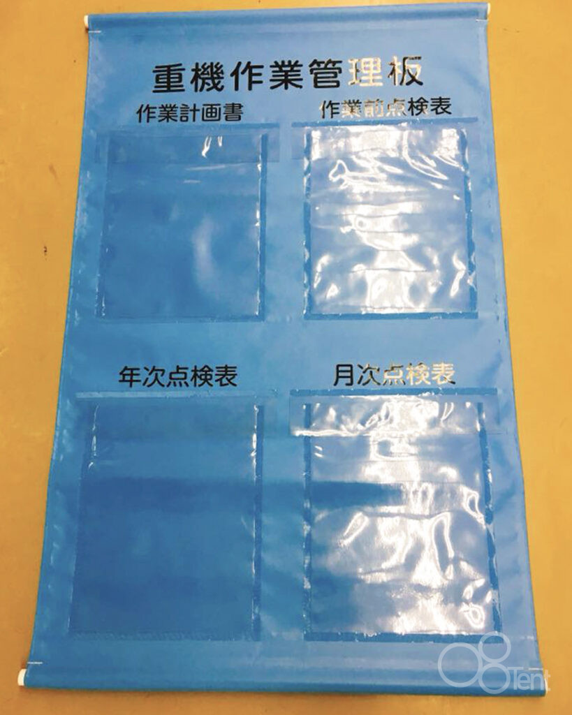 特注ウォールポケットを膜材にて製作いたしました。現場での書類など管理する目的で使用されるそうです。