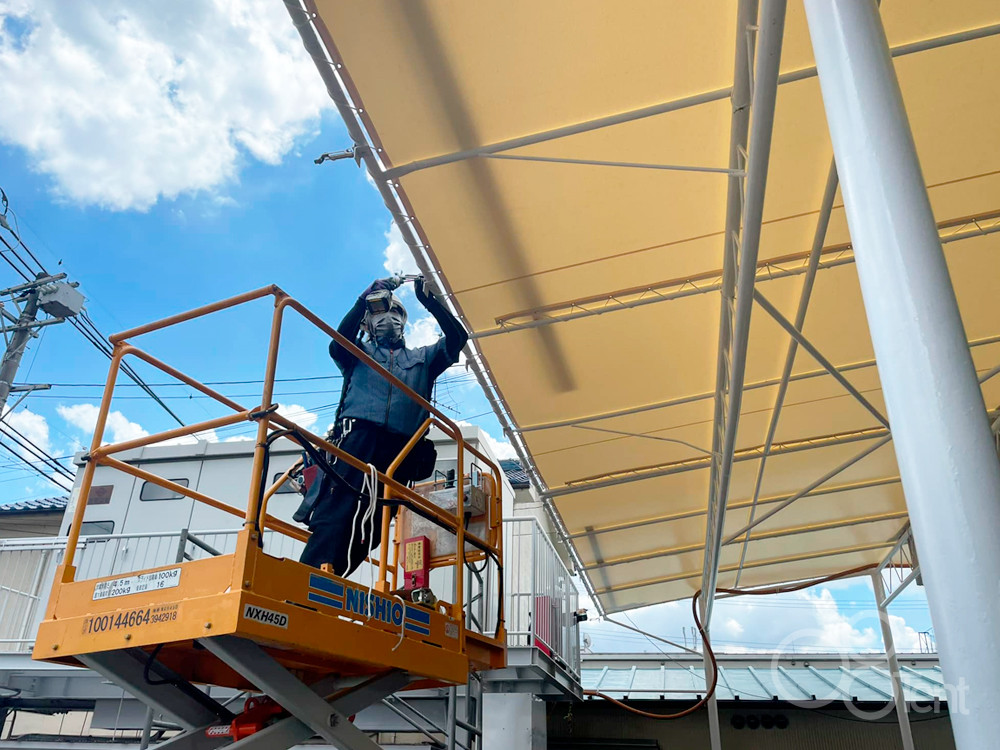 工場入口の雨よけ用上屋テントのシート張替えを行いました。