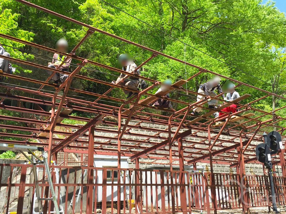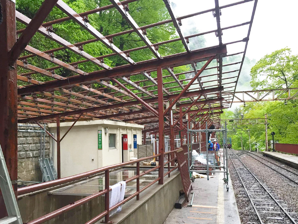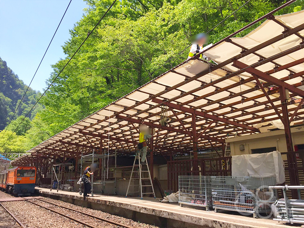 落石防止用の上屋テントを駅ホームに施工|富山県黒部市