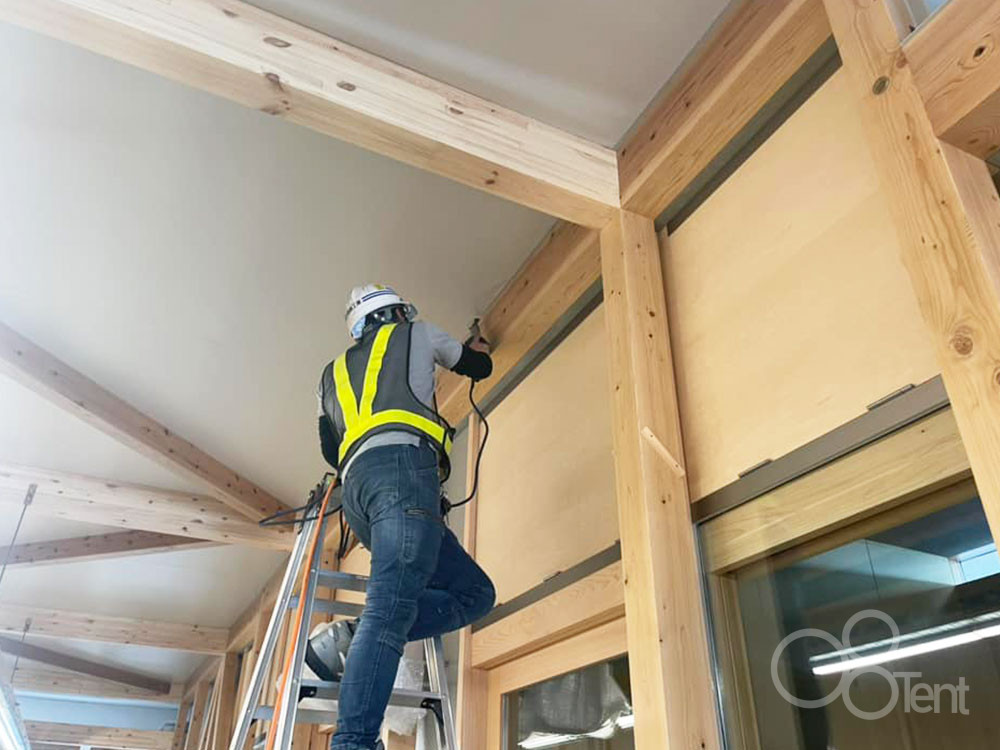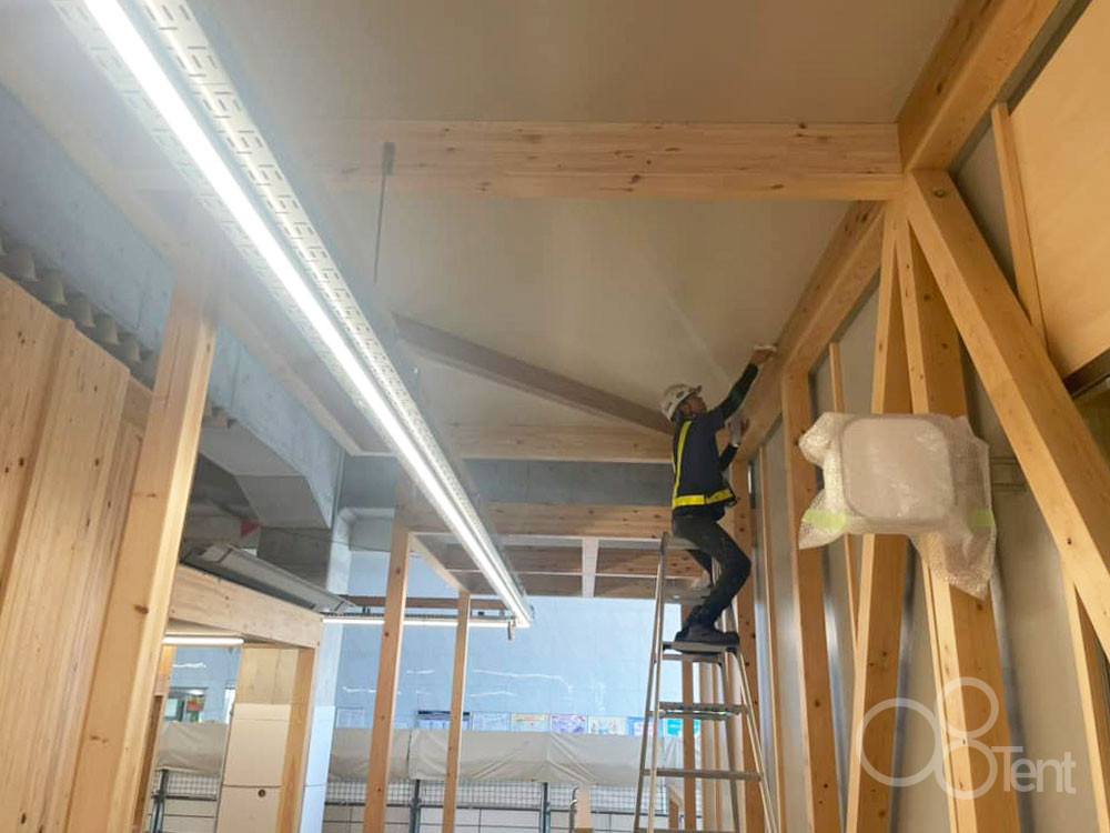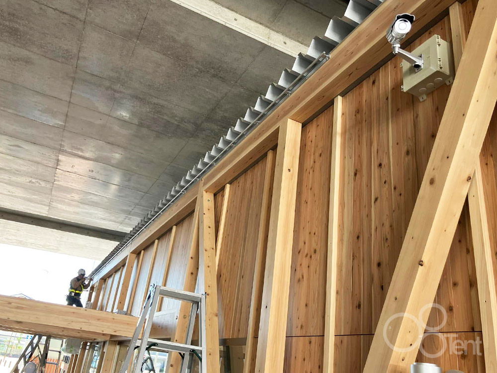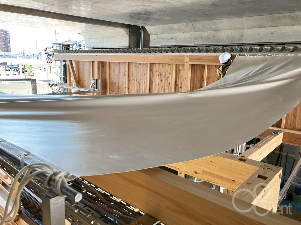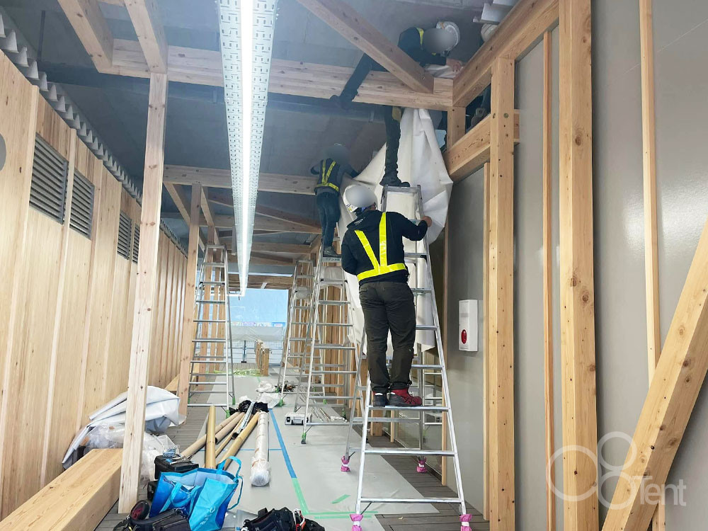 高架下の木造商業施設の膜天井を施工|愛知県江南市