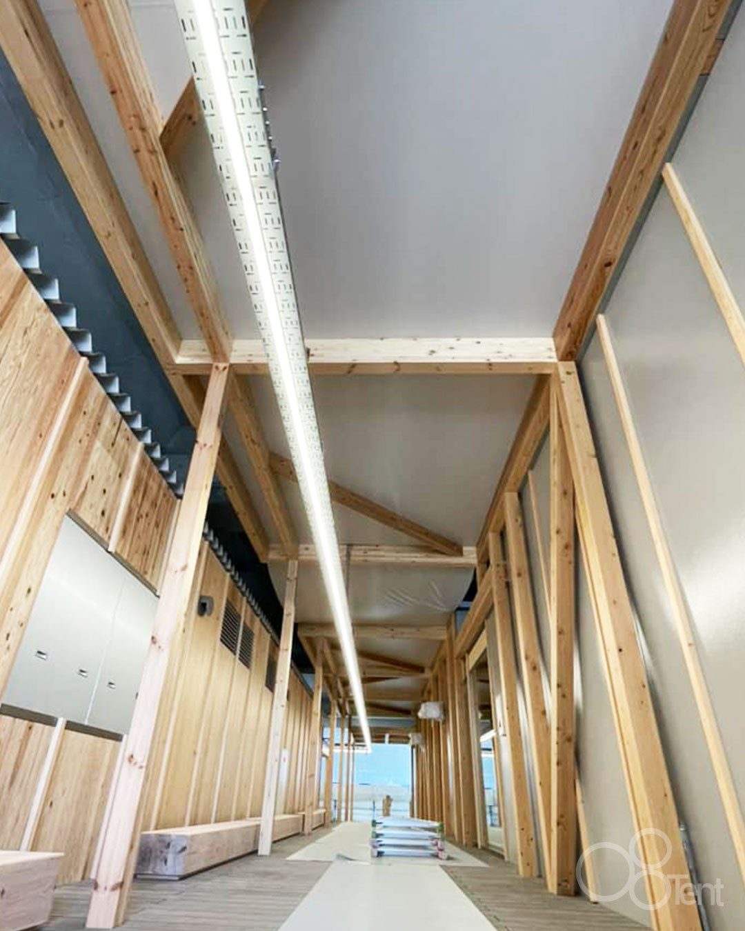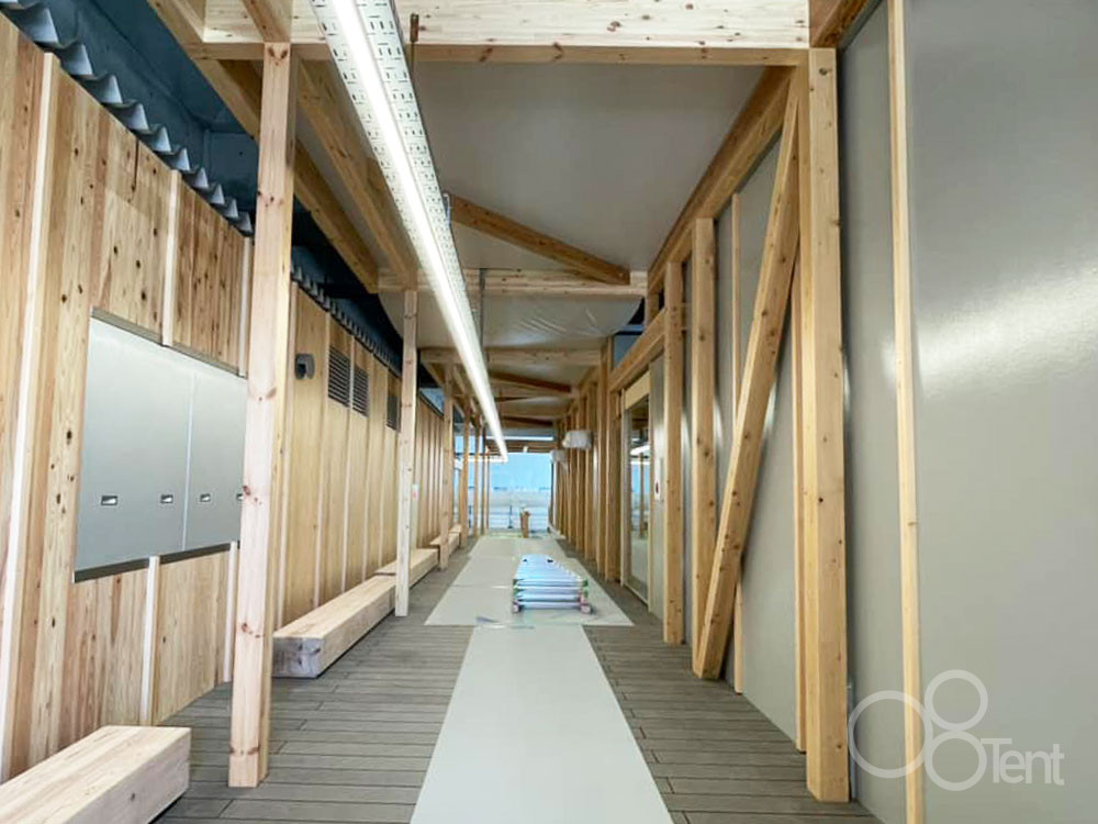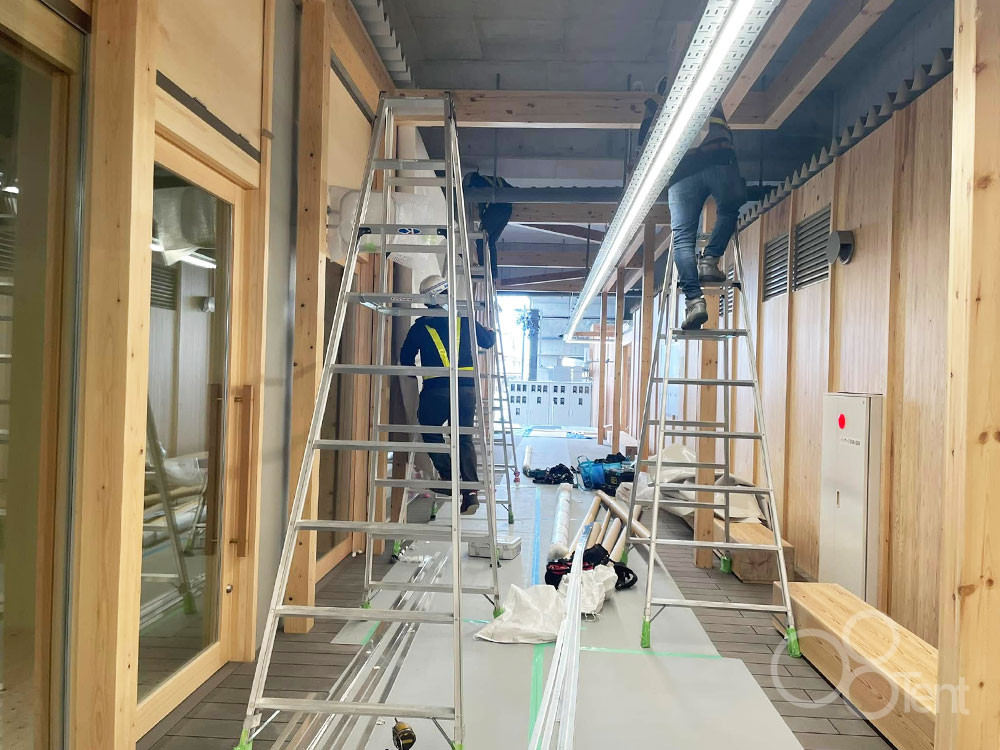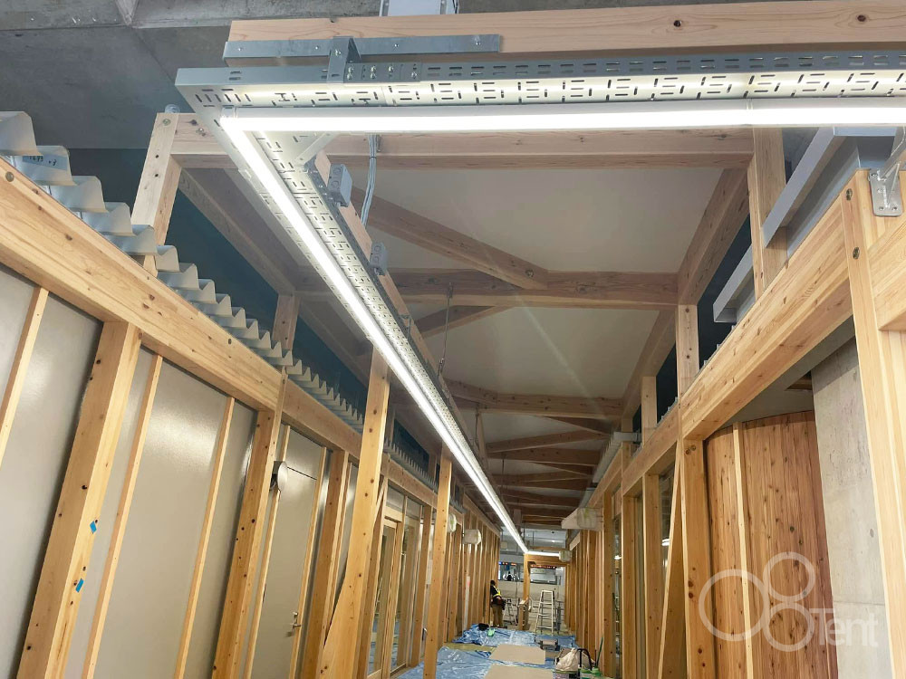 高架下の木造商業施設の膜天井を施工|愛知県江南市