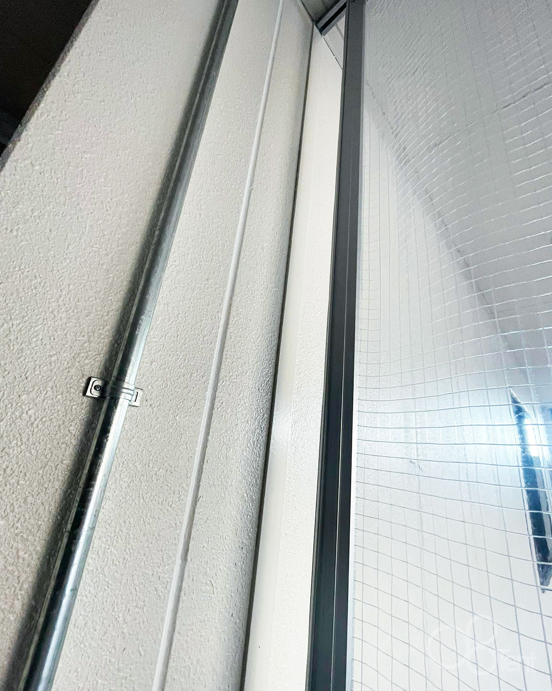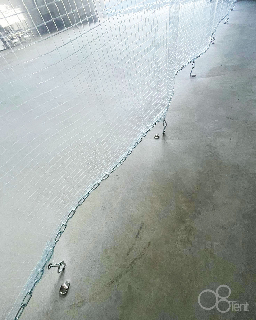 カーテン下部にはチェーン重り、7ヶ所にカラビナフックを取り付け、床に取り付けた金具と固定できる仕様です。水しぶきや風が吹いてもバタつきづらくなります。