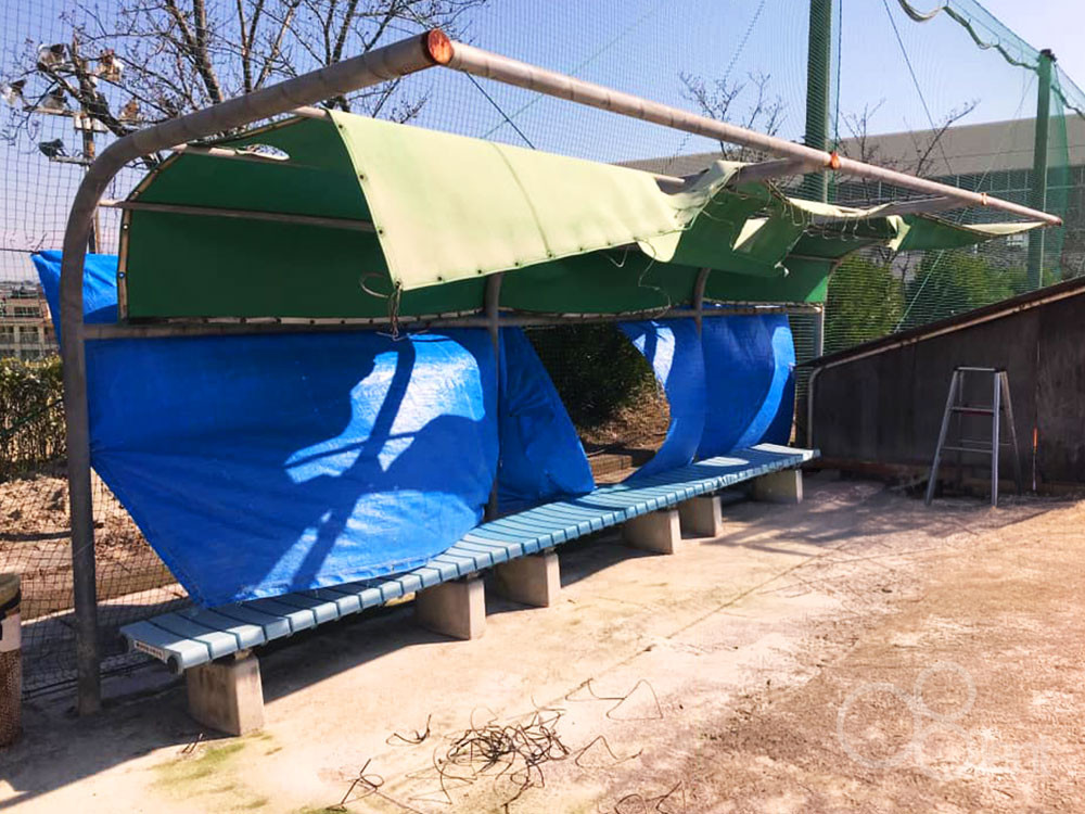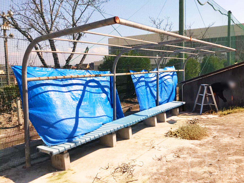 グラウンドベンチ用の日よけテント屋根(休憩スペース用テント)のシート張替え・フレーム再塗装を承りました。
