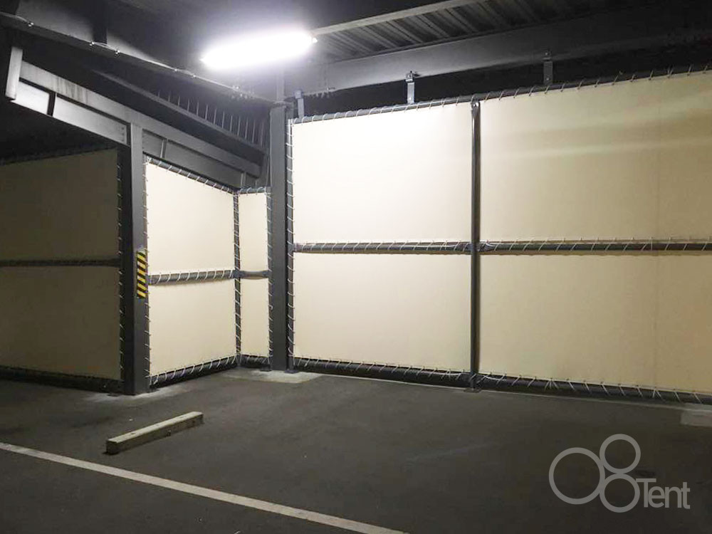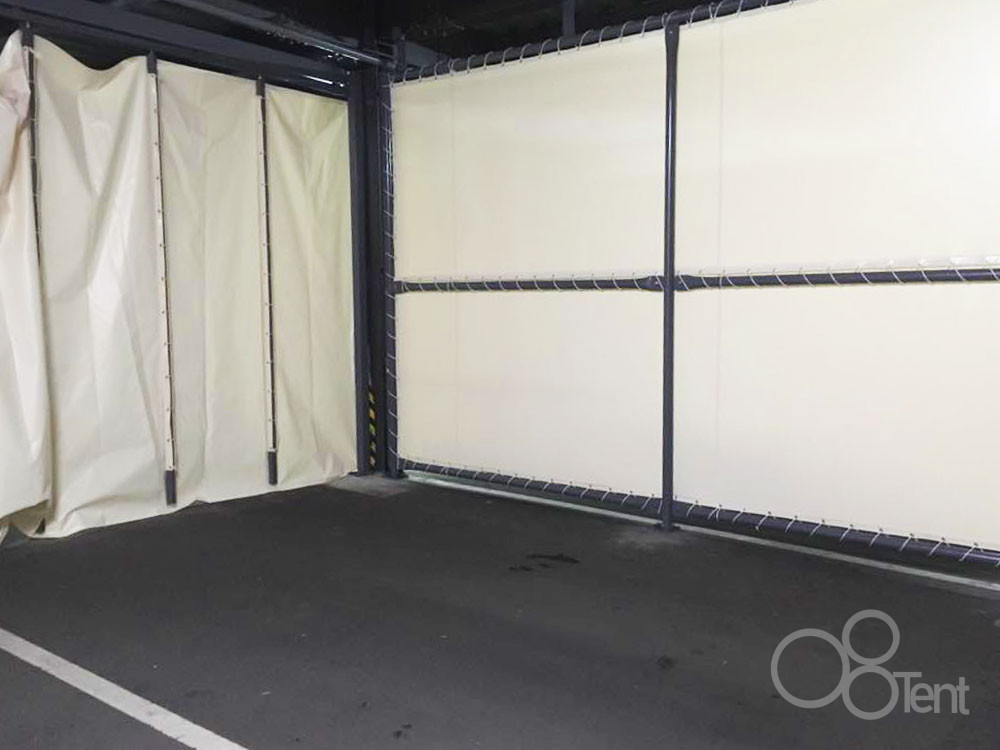 駐車場にシート間仕切り壁・芯材入りカーテンを新設いたしました。