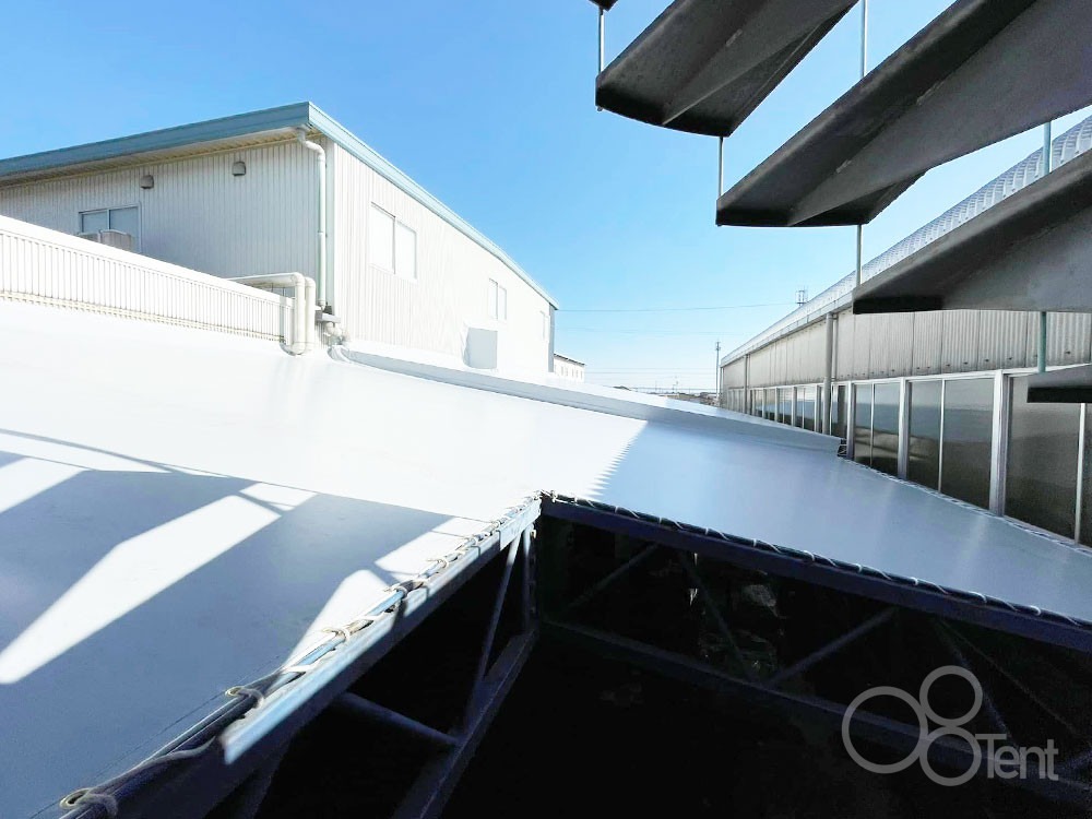 上屋テント(テント屋根)は、雨よけ・日よけ用として、工場や倉庫・トラックヤードなどで利用される大型のテント屋根です。商品や材料の荷捌き、積み下ろし、作業場としてご利用いただいています。