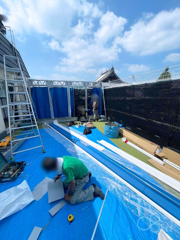 プールサイドは真夏の日差しで大変熱くなるため、休憩スペース用の日よけテントは欠かせません。また、プール自体へシェードを設置することで直射日光を軽減し、水温が上がり過ぎることを防ぎ、紫外線対策にもなります。