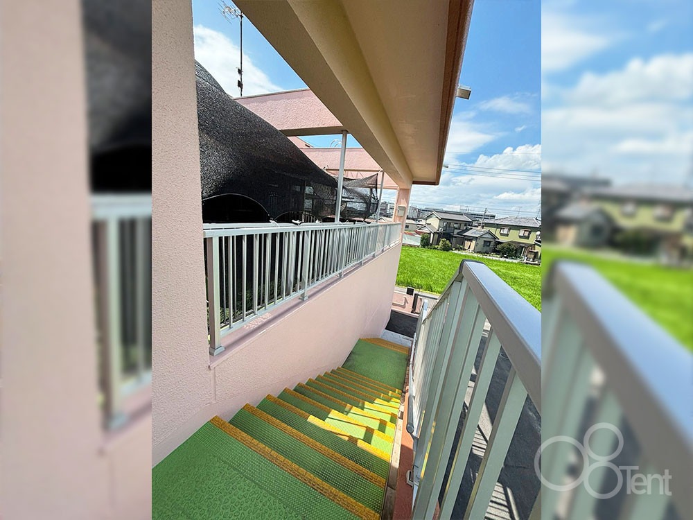 雨で滑りやすい外階段も、雨よけテントがあると濡れにくくなるので小さい子供の上り下りもしやすくなります。
