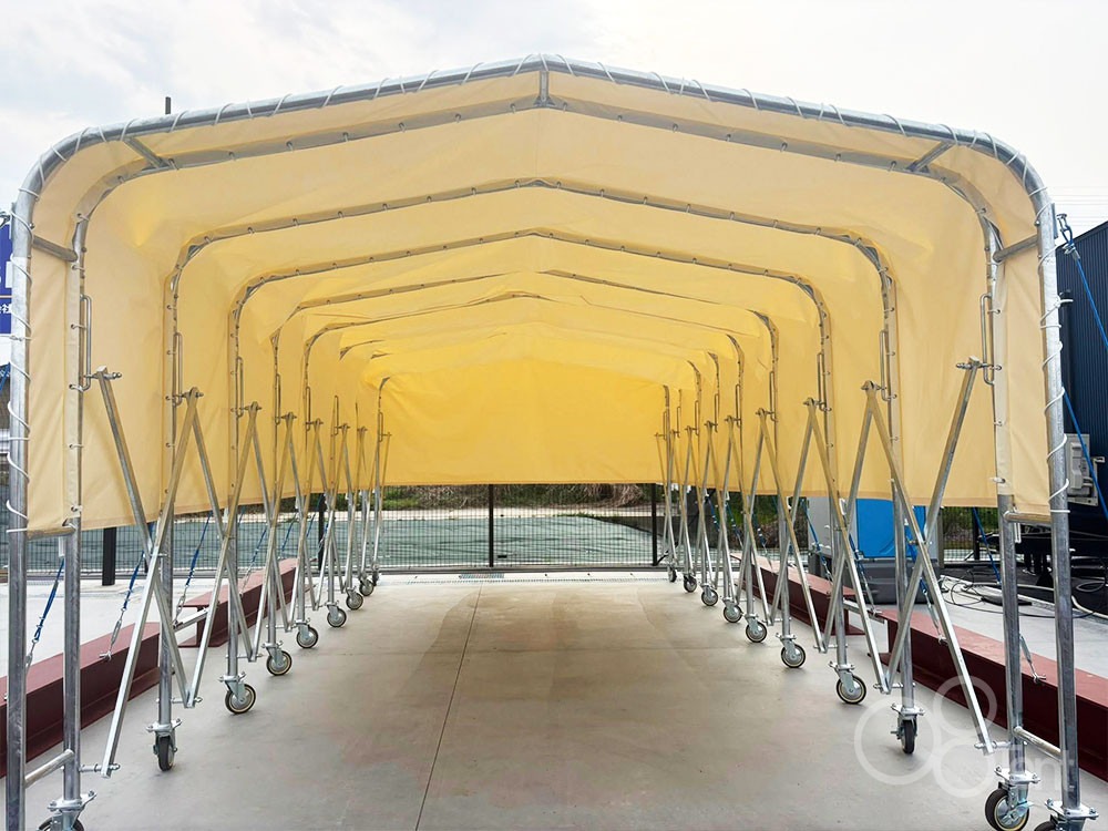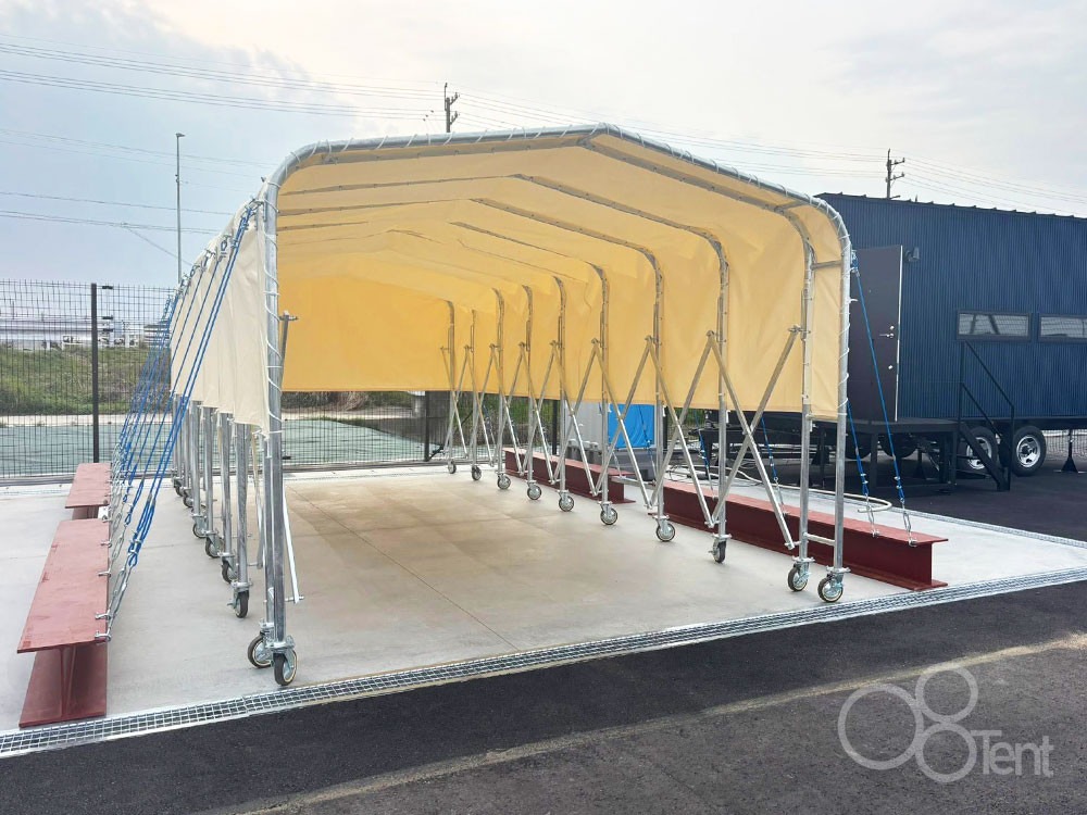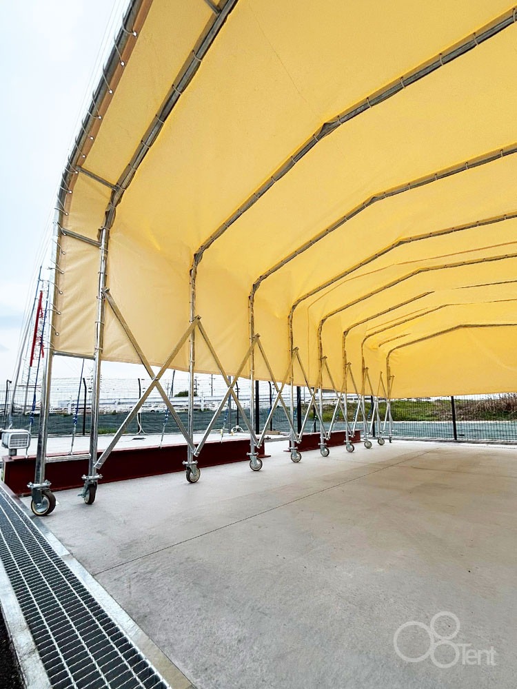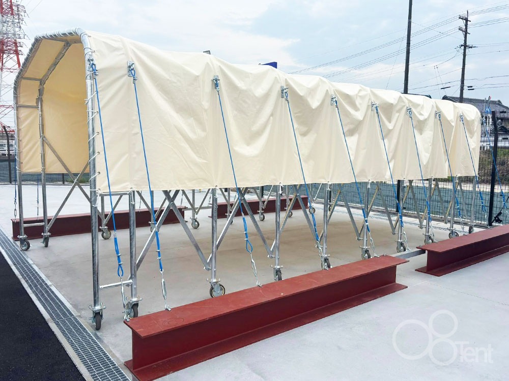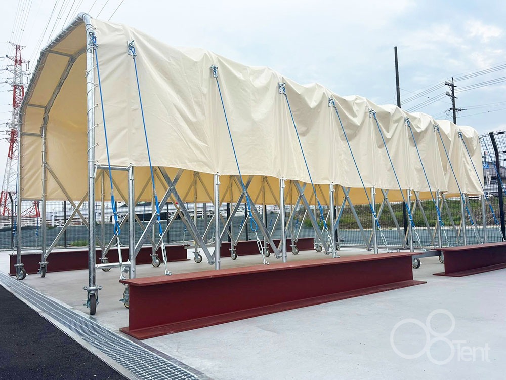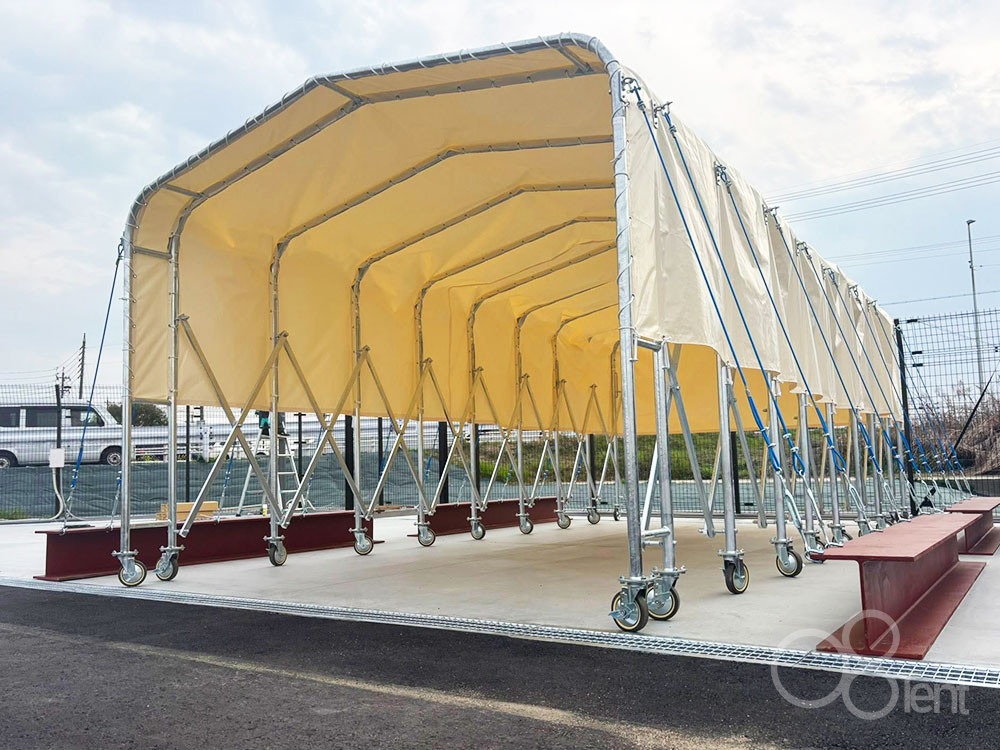 ジャバラテントとは、ジャバラ状の伸縮可能な支柱にテントシートを取り付けた、可動式のテントです。サイドがジャバラ状になっているため、必要ない時には折り畳むことが可能です。地面にレールを設置しキャスターを取り付けてあるため、大型のものでも手動で開閉することが可能です。