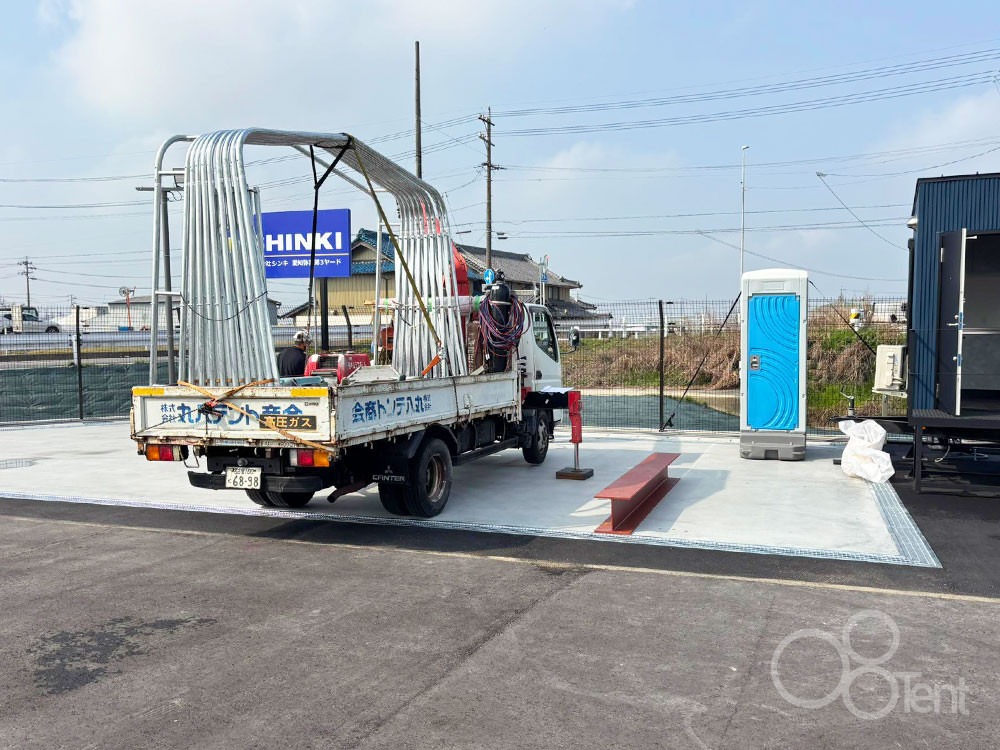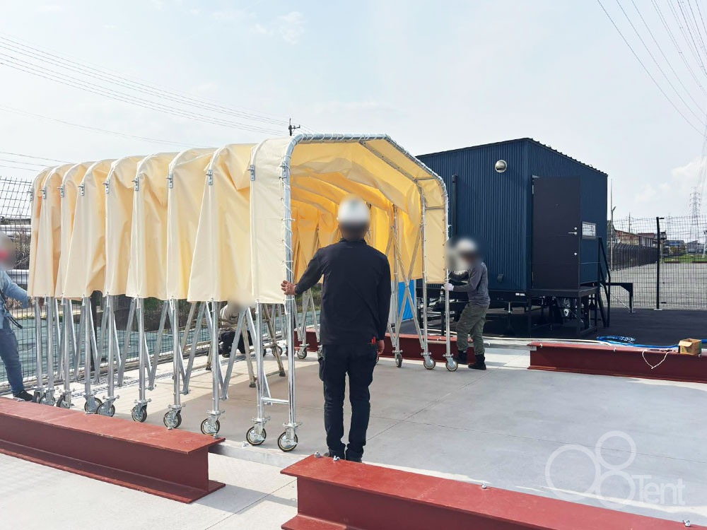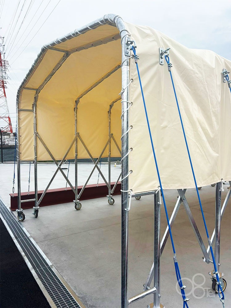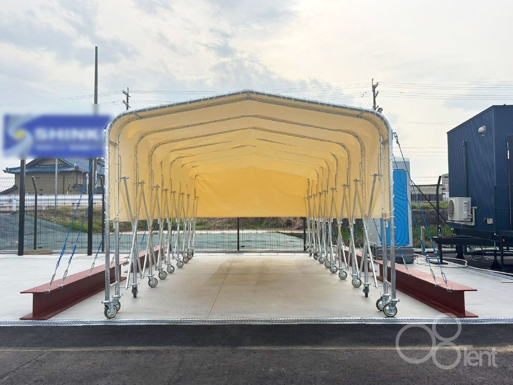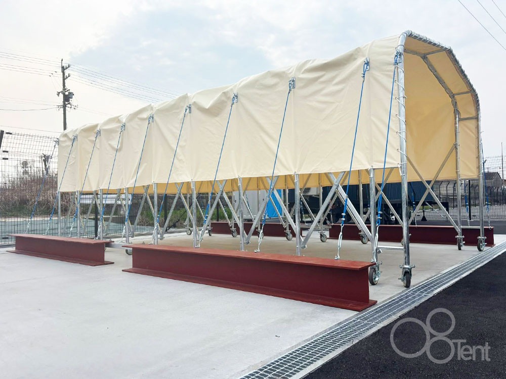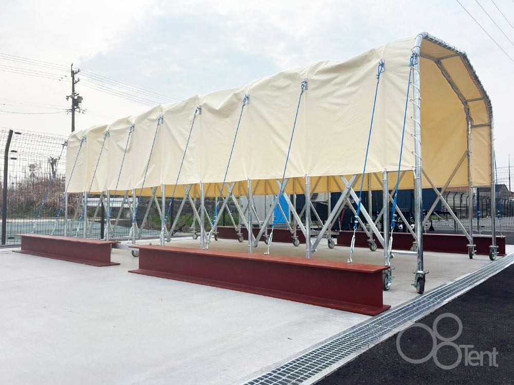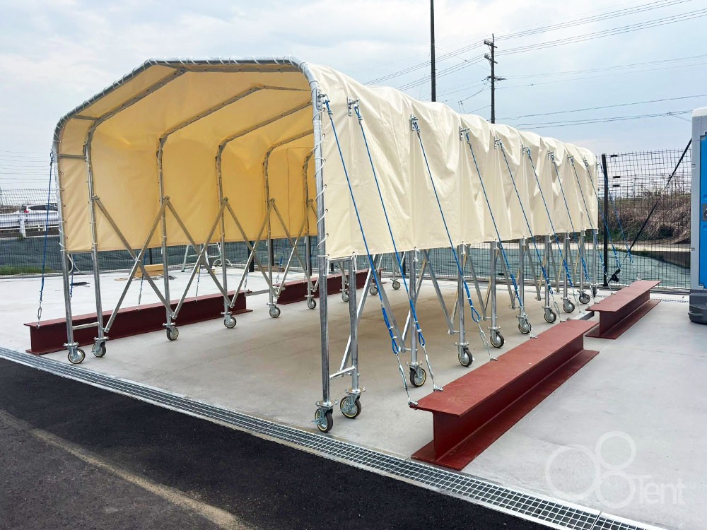 洗車時などの必要な時に屋根が欲しいとのことで、キャスターで可動させられる伸縮式テントをご提案させていただきました。