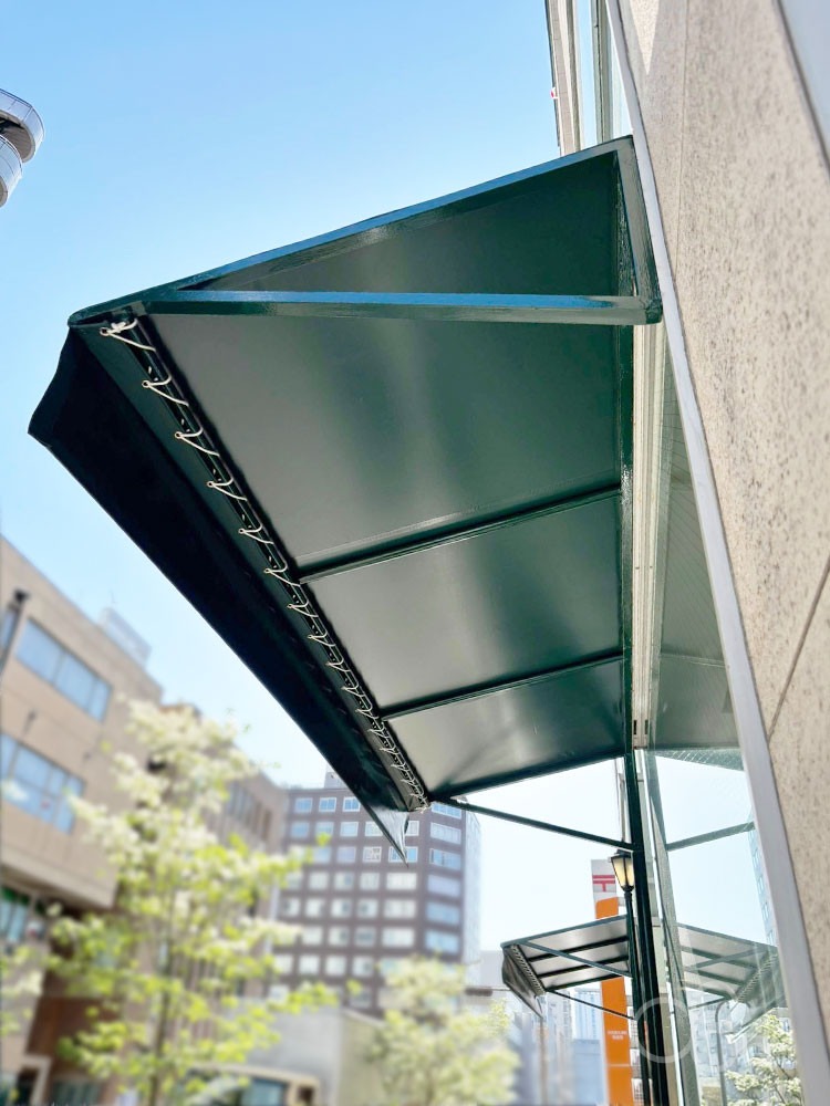店舗用テントとは、お店や建物の入り口・外壁・窓周辺などに取り付ける日よけ・雨よけとして利用できる固定式のテント屋根です。
