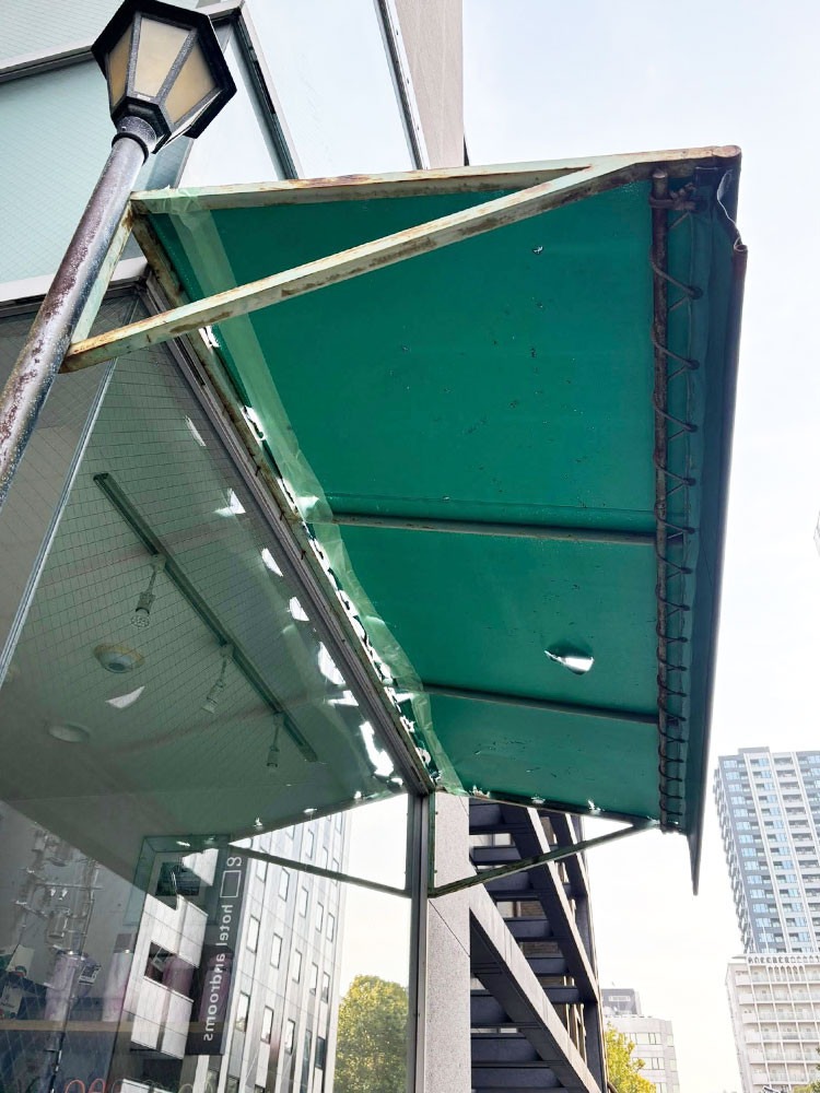 店舗用テントのフレームを再塗装する際、照明ポール再塗装も合わせて行うことで、統一感がある店舗外観となりました。