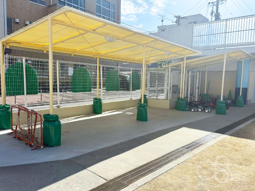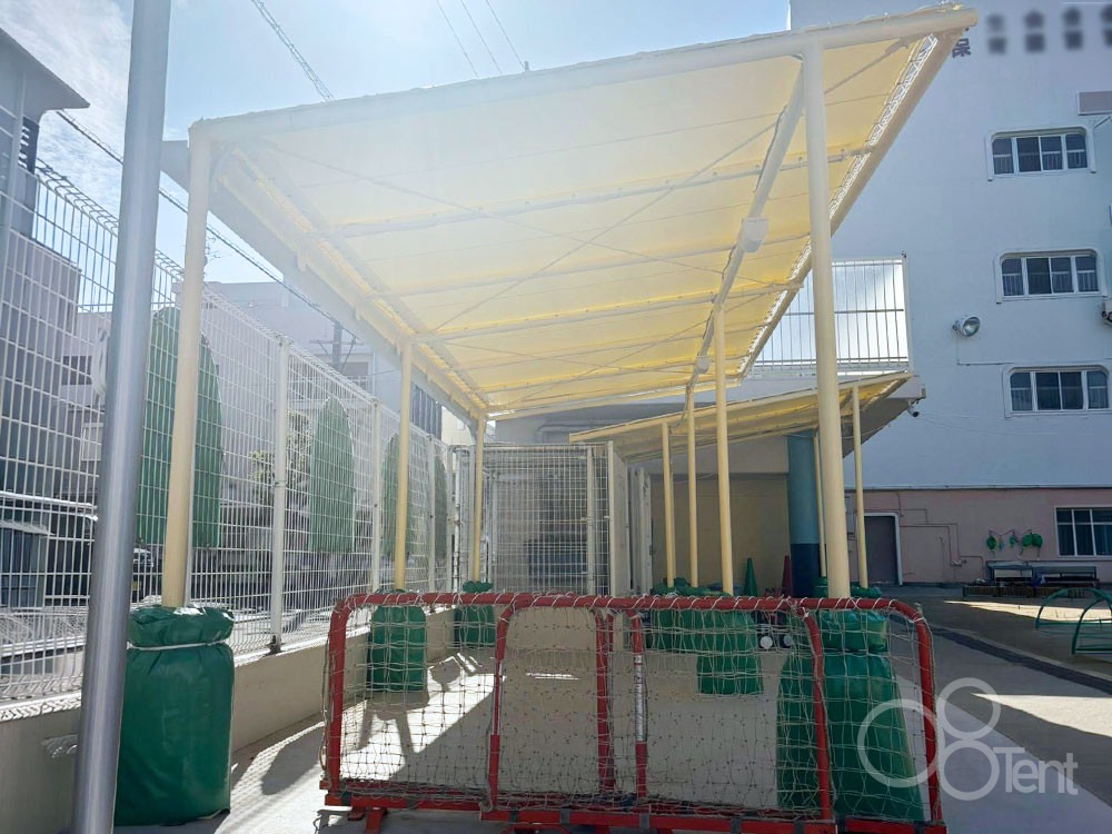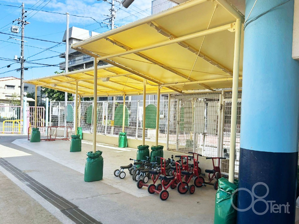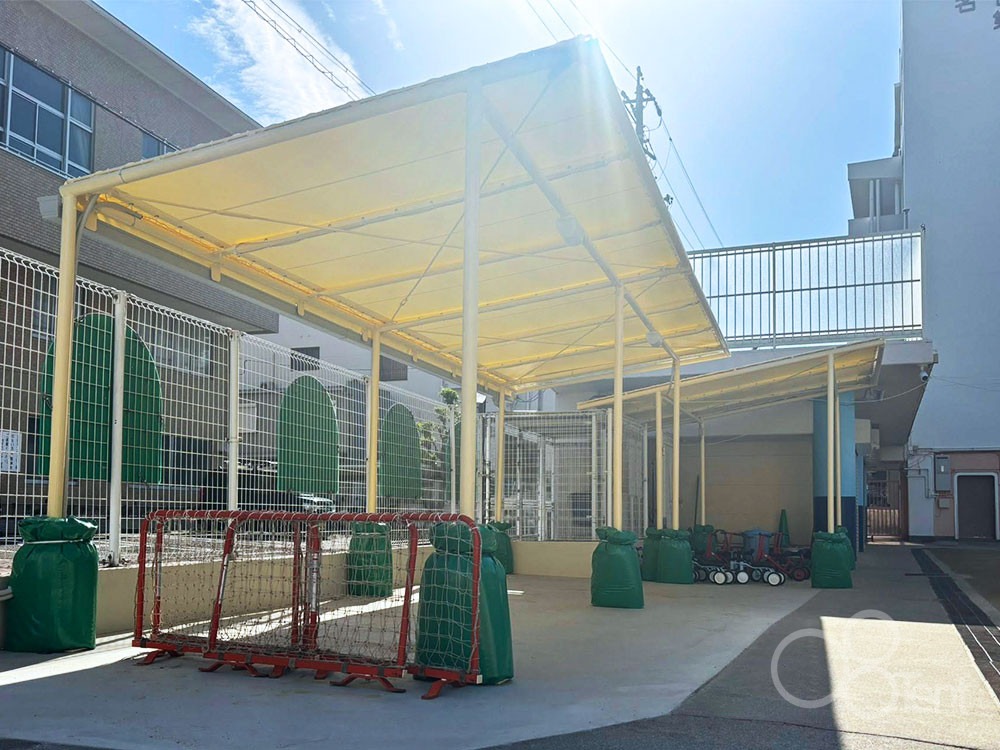 駐輪場テント屋根を保育園敷地内・園庭横に新設施工|愛知県名古屋市