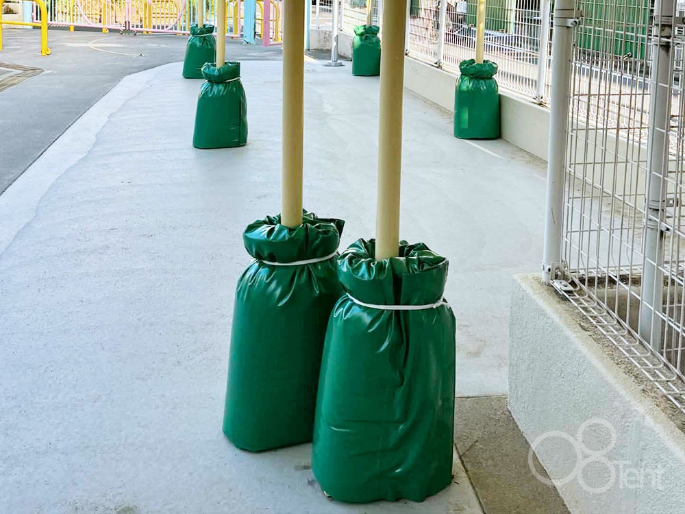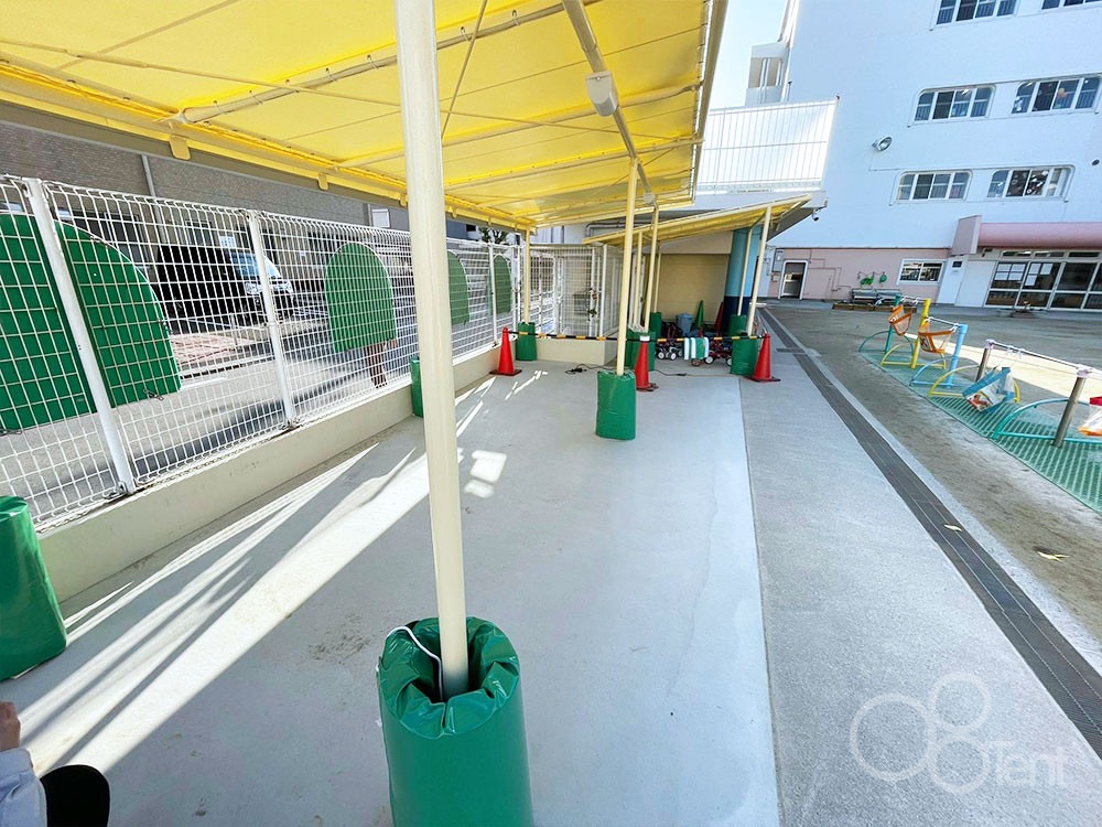 園庭内ですので、フレームの柱足元には柱ガードを巻き付けています。誤って園児さんがぶつかっても衝撃を緩和することができます。