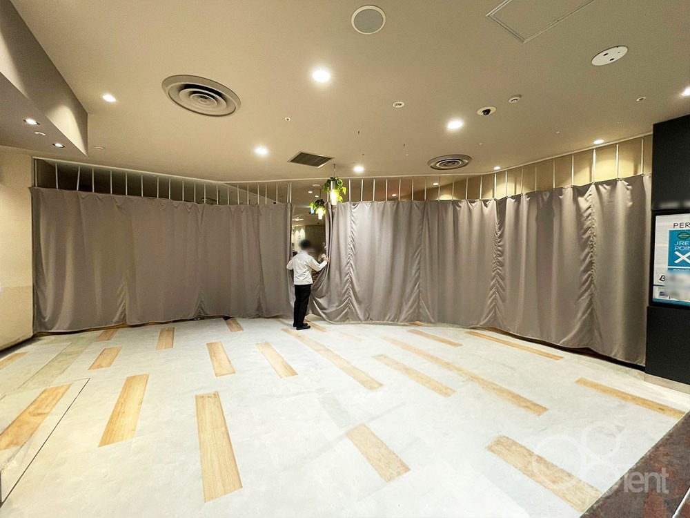 千葉県千葉市の駅併設商業施設内において、他店舗より早く閉店するテナント店舗の区画を仕切るための、大型間仕切りカーテンを製作・施工いたしました。消防設備の作動を妨げない機能性と、施設全体のグレードを維持するデザイン性を両立させた施工事例です。