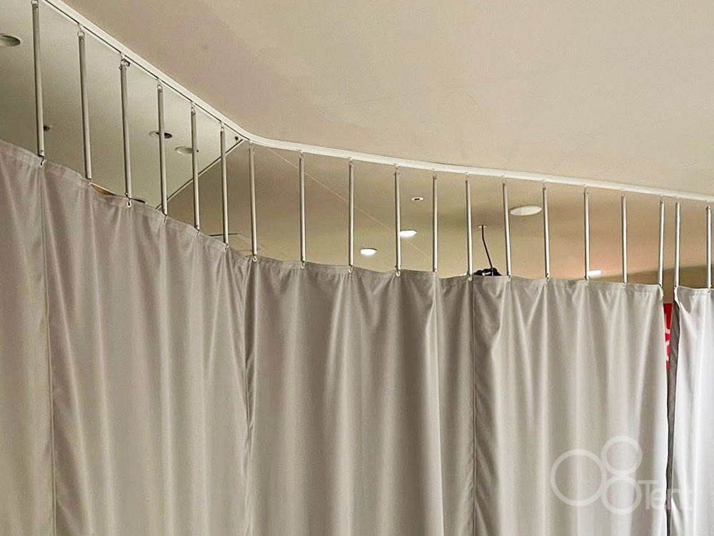 消防設備との兼ね合いで「メッシュカーテン」を検討される施設担当者様は多いですが、今回の「アルミパイプ仕様」は、見た目の高級感と実用的な堅牢さを兼ね備えた、より現代的な解決策です。ファブリックにはグレー系のカラーを採用し、落ち着いた高級感のある仕上がりとなりました。