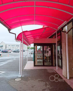 EV充電スペースに雨よけテント屋根を設置。雨天時も安心して利用できる環境を整備した事例です。屋外EVステーションの雨除け・日除け対策に最適な膜構造施工をご紹介。