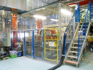 伸縮式テントの施工詳細 工場内に伸縮式(ジャバラ式)開閉テントを施工しました。 必要に応じて伸縮が可能です。クリーンルームとして、大型機械のカバーとして利用できます。