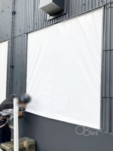 開閉式テントの施工詳細 開閉式テントを工場施設に施工いたしました。3色のシートを使用しました。エリア分けに活用いただけます。 施工中の様子です。 完成した開閉式テントです。